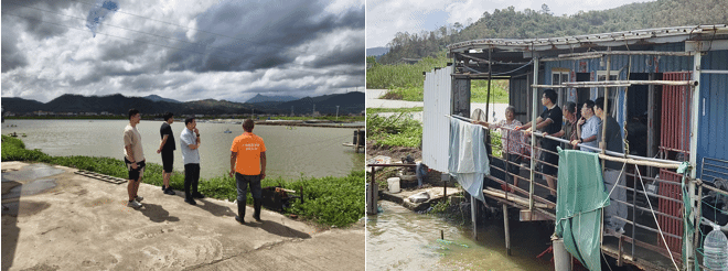 团队首站抵达台山市聚龙渔业养殖有限公司和附近的养殖场。现场勘查发现,该公司养殖设施及存塘鱼类在台风中受损严重。苏友禄教授团队细致分析了灾后可能爆发的鱼类健康风险,重点就水体环境快速修复、死鱼无害化处理、灾后疫病监测与预防性用药等关键技术环节,提供了科学、实用的指导意见,旨在帮助养殖企业最大限度控制次生灾害,降低损失。