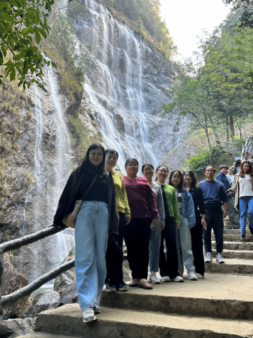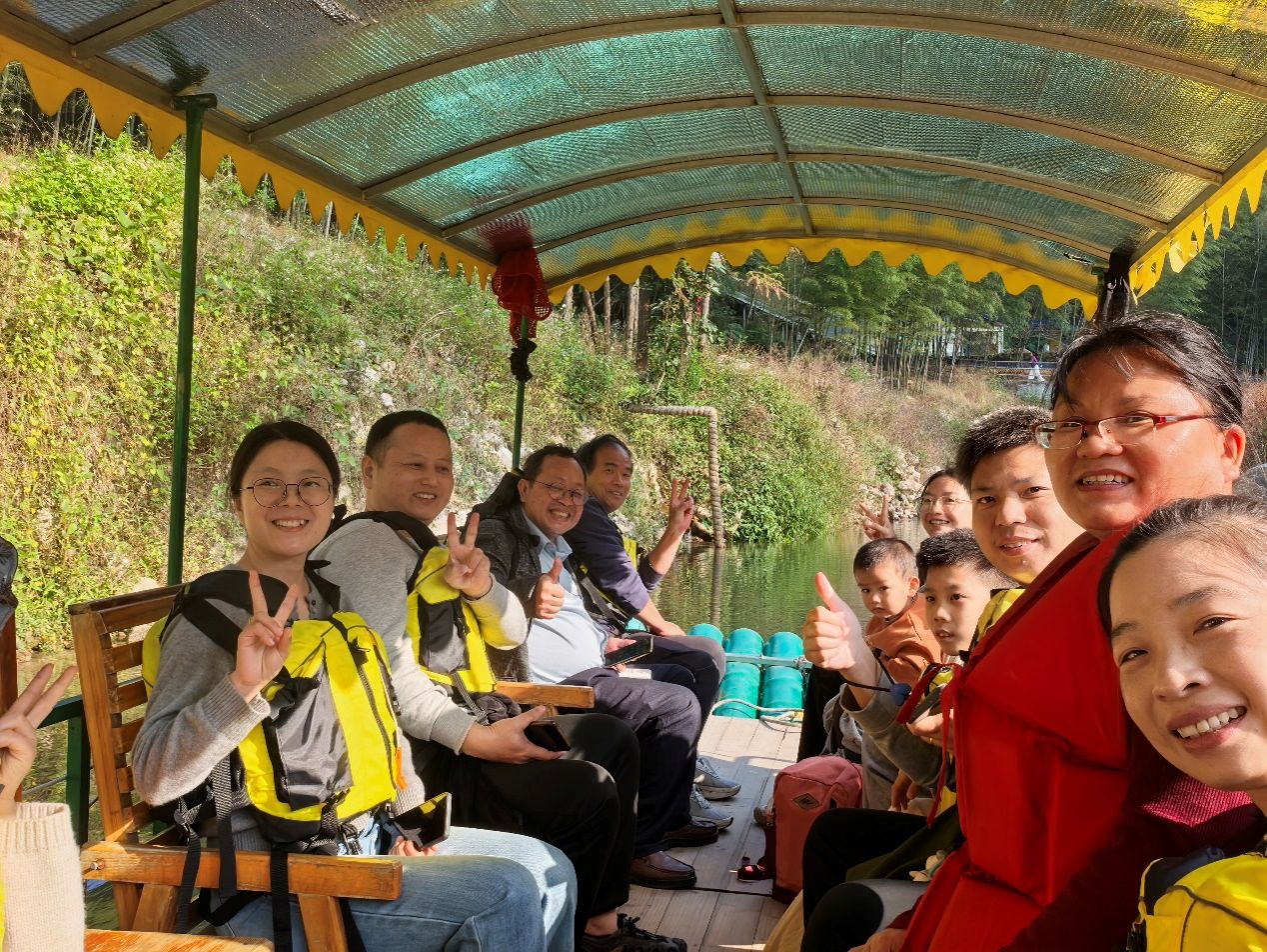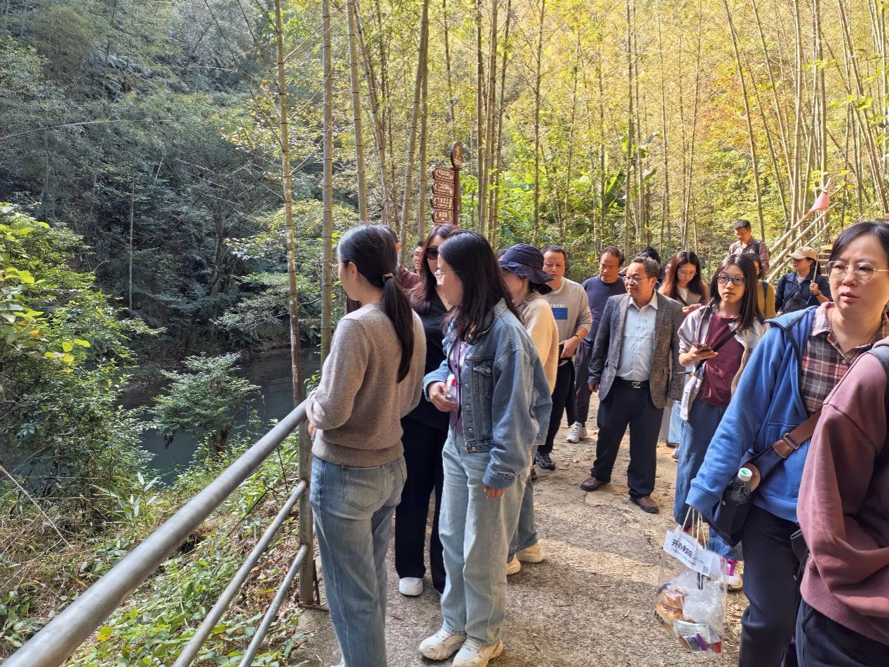在千龙沟大瀑布景区,教职工乘坐竹筏,欣赏漫天高耸入天的竹海,爬过蜿蜒曲折陡峭的山路,行军近1个多小时,在半山腰领略到瀑布巨龙从山顶倾泄而下的威势,水龙从左到右挂满了水壁,壮观奇杰令人叹为观止。