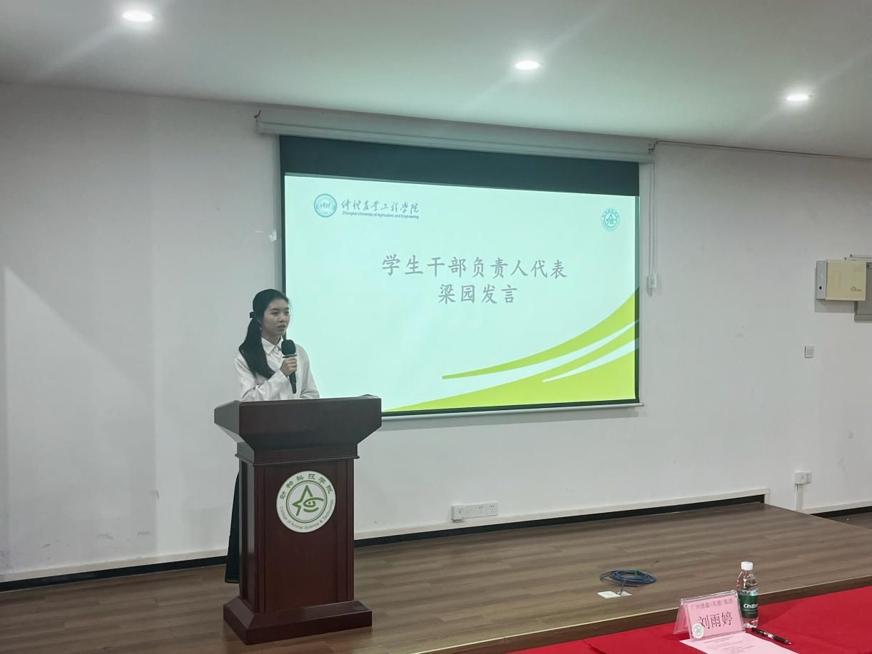 员工干部负责人代表梁园,介绍了科技文化节系列活动的前期筹备情况,她表示作为动科院学子,要深耕专业知识、夯实学业基础,同时主动加强科技创新能力培养,积极参与各类科创实践活动,以青春之姿践行“学农爱农、强农有我”的使命担当。